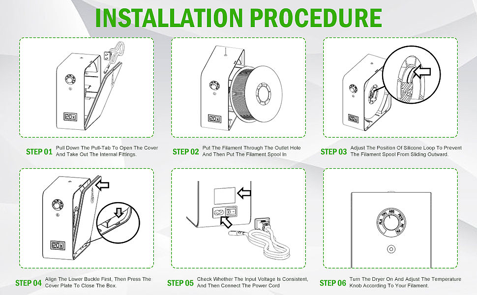 The main filament types are marked to facilitate users to quickly identify and select the right material. You can easily adjust the heating temperature within the range of 40-65℃ by simply turning the knob. This design can flexibly meet the needs of different filaments, ensuring that each material is heated at the optimal temperature to maximize its performance and printing effect. At the same time, the intuitive temperature setting makes the operation easier and improves work efficiency.
