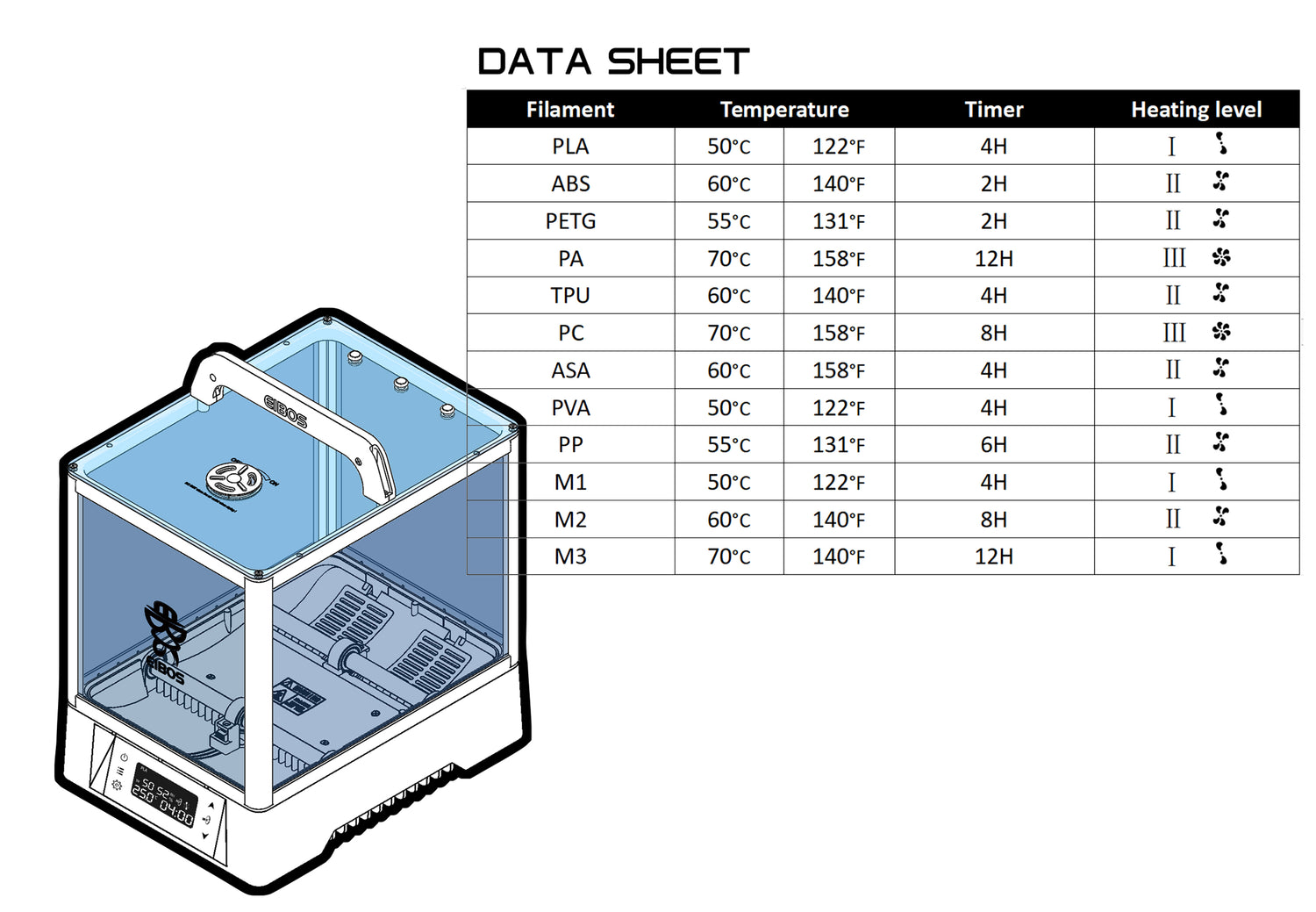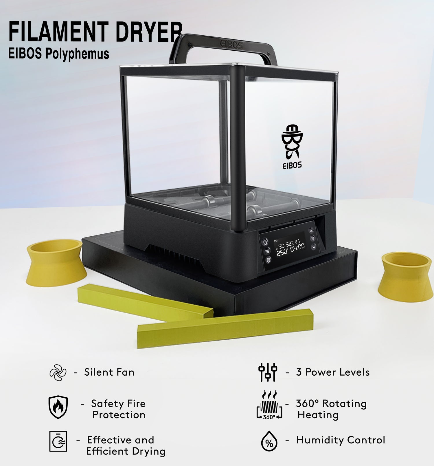 We are EIBOS, a start up 3D printing company, was founded in 2020. Kickstarter is where we started. Our first product EIBOS Filament Dryer Cyclopes launched on Kickstarter at September 24, 2020 and was supported by 1339 users. Although we only had limited conditions and resources at that time, we completed the delivery on time and strictly abided by the rules of the platform - no sales on any other platform until the Kickstarter Backer receives the goods. As a young company, we are grateful to those who initially supported us through Kickstarter. We are nothing without your help and support. The following year we launched our single roll filament dryer Series X: Easdry. We firmly believe that active drying and external circulation are the basic methods that an effective 3D printing filament dryer should using. This may be different from or contrary to the mainstream filament drying methods on the market at that time, but we are still firm in our way. Just like our name EIBOS, we believe in structure, experiments, and data. We hope that through our research and exploration we can create products that can truly help users. This is our original intention, and we have never changed this view and attitude. At present, in the 3D printing industry, even those large companies and skyscrapers are trying to use our original ideas and designs to develop their similar products. This is a great recognition for us. As the first 3D printing filament dryer manufacturer on the market to use PTC as the heating element, we have collected a large amount of information and data on filament drying and drying equipment, which also includes our analysis of user usage. After nearly a year and a half of development and testing, we are here to officially launch our new generation of filament dryers: Polyphemus