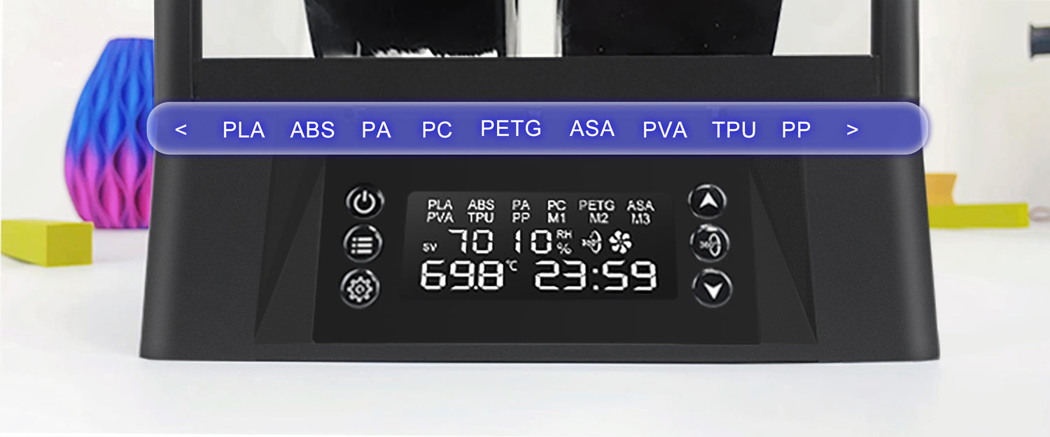 The program has built in baking parameters for 9 types of materials: PLA, ABS, PA, PC, PETG, ASA, PVA, TPU, and PP. There are also 3 additional customizable material slots: M1, M2, and M3. Each material parameter includes settings for temperature, baking time, and heating power level. You can modify these parameters based on the specific requirements of your materials, and the built in system will save your settings even in the event of a power outage.
