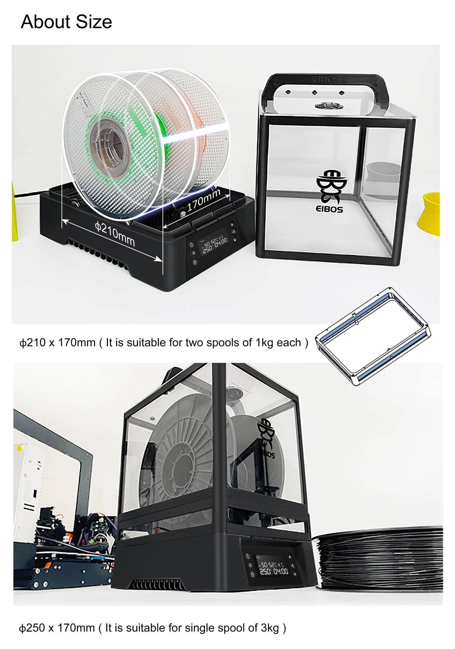 After installing the expansion module, Polyphemus expands from its original 210mm diameter to accommodate a larger 250mm diameter. This increase in size allows for the capacity to hold up to 3kg of filament.
